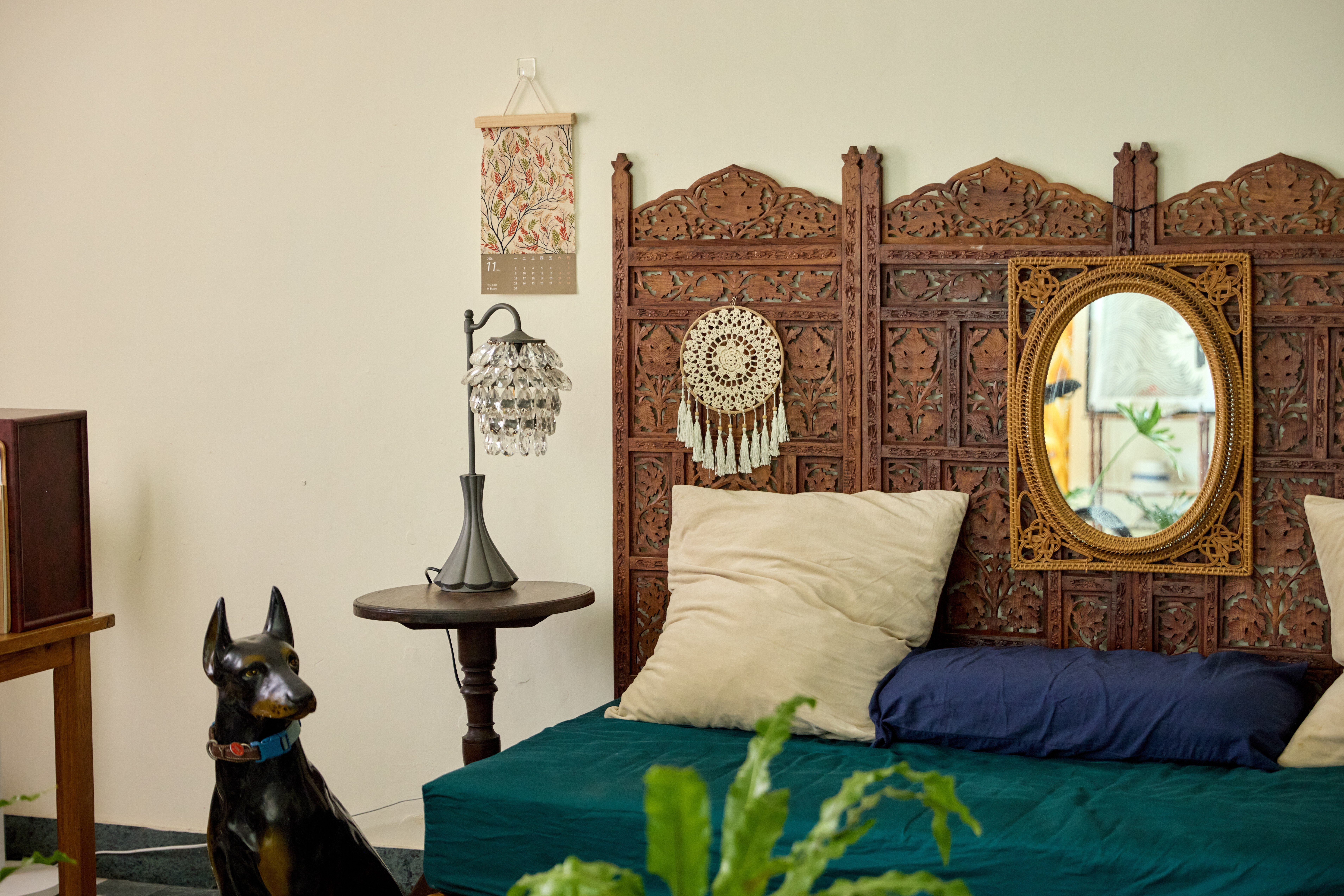 Sophie 分享,她喜歡逛跳蚤市場,像福和橋下跳蚤市場,她已經逛多年,常能挖到特色又便宜的物品。「在工作室裡,我會把印地安文化的捕夢網、日式屏風、泰國沙發,甚至從老物社團挖到的水晶燈放在一起,雖然元素不同,但融合起來卻不突兀,呈現平衡的美感。」