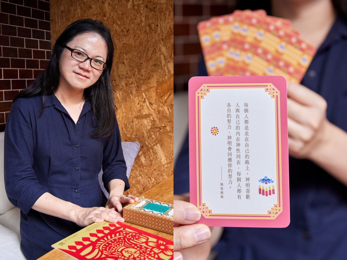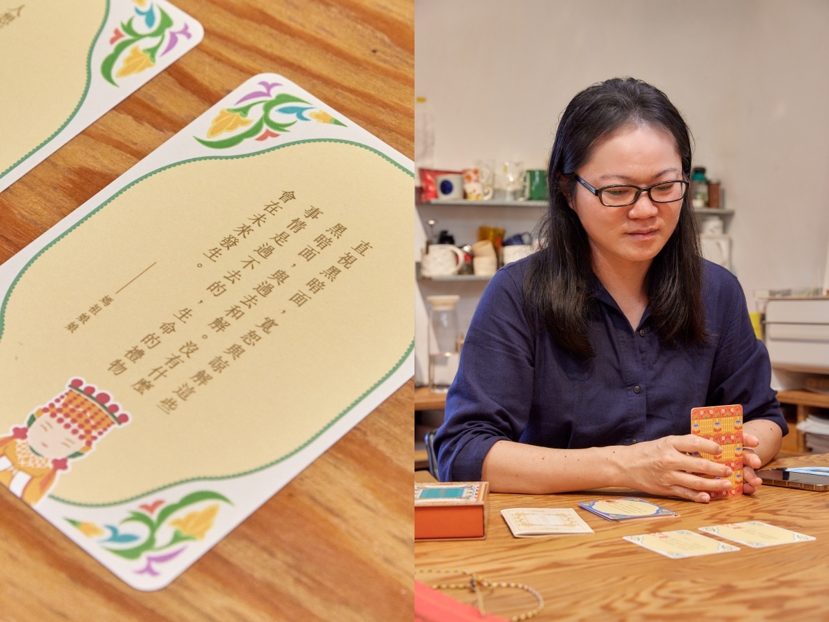 我覺得這就很像去廟宇抽籤,但現在我們不用親自到廟宇,在家就可以幫自己抽。而且傳統籤詩充滿古人的大智慧,但文言文常有解讀門檻,需要相對應的智慧或生命累積才能讀懂。這套卡片則用直觀、簡單的文字,將神明的慈悲轉化為日常提點,大家也比較容易看懂。