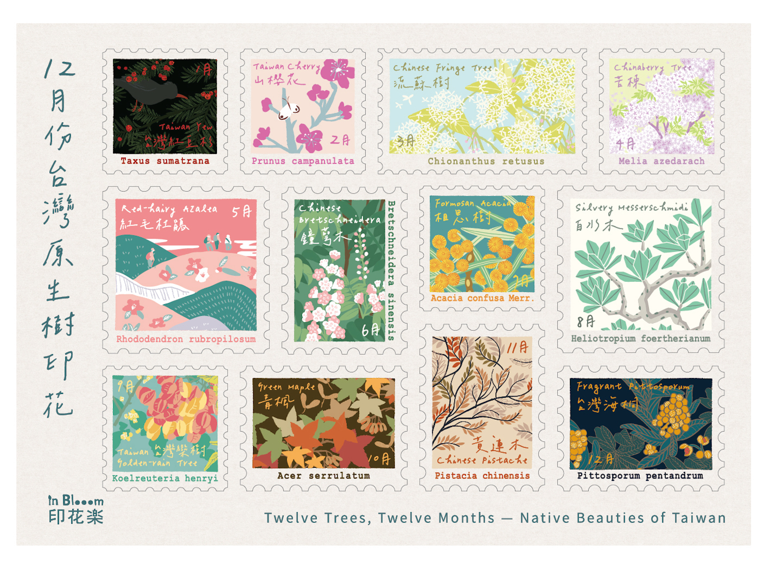 台灣原生樹貼紙(含中英文版),以郵票造型勾勒邊框,12幅台灣原生樹印花穿插四季,