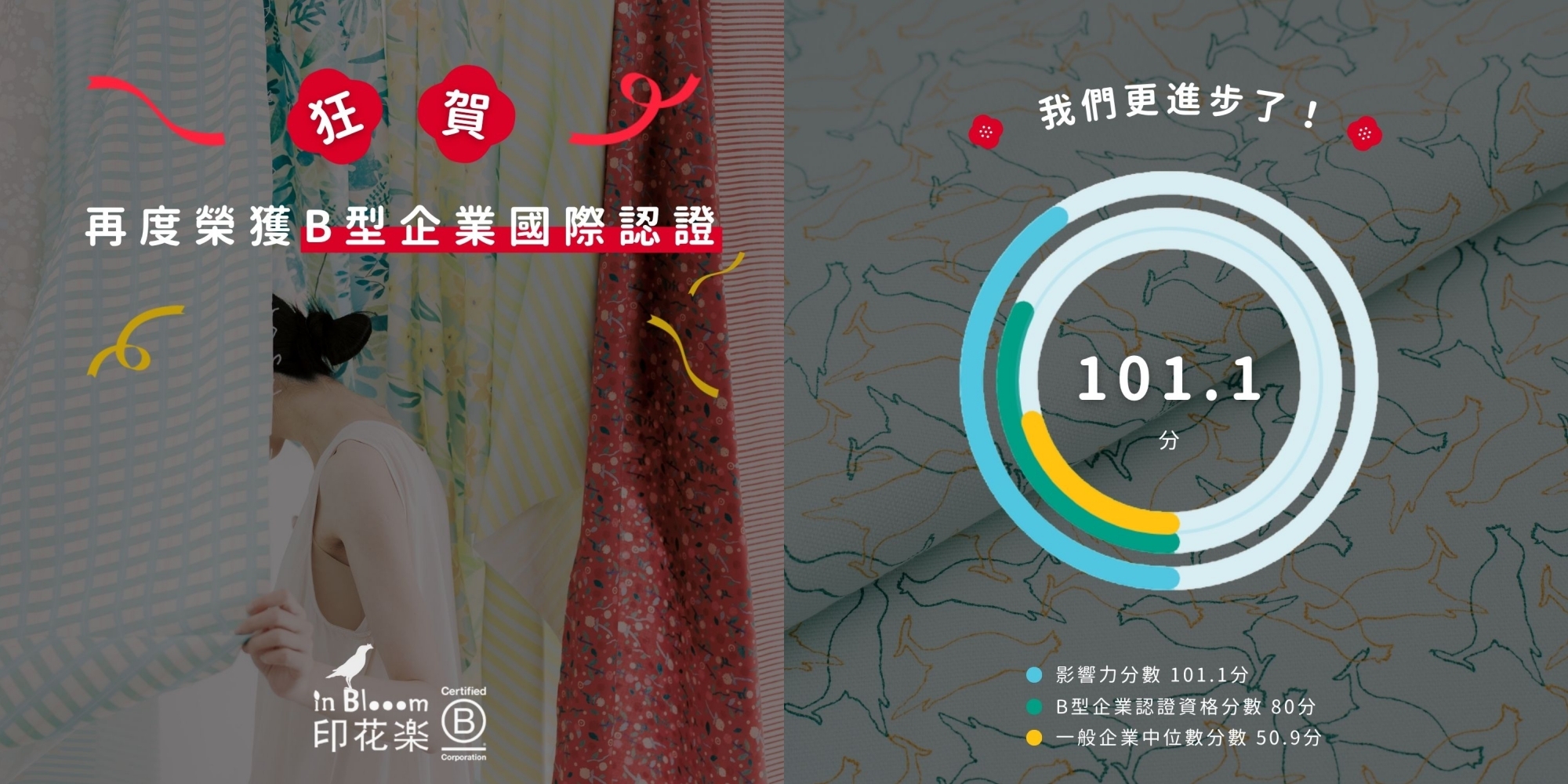 2025 年,印花樂再次以 101.1 分榮獲國際B型企業認證,分數更是進步了 10 分!特別在「社區照顧、員工照顧、環境友善」方面表現較突出。透過申請認證的過程,也是檢視我們自己是否成為心目中「好企業」的機會!