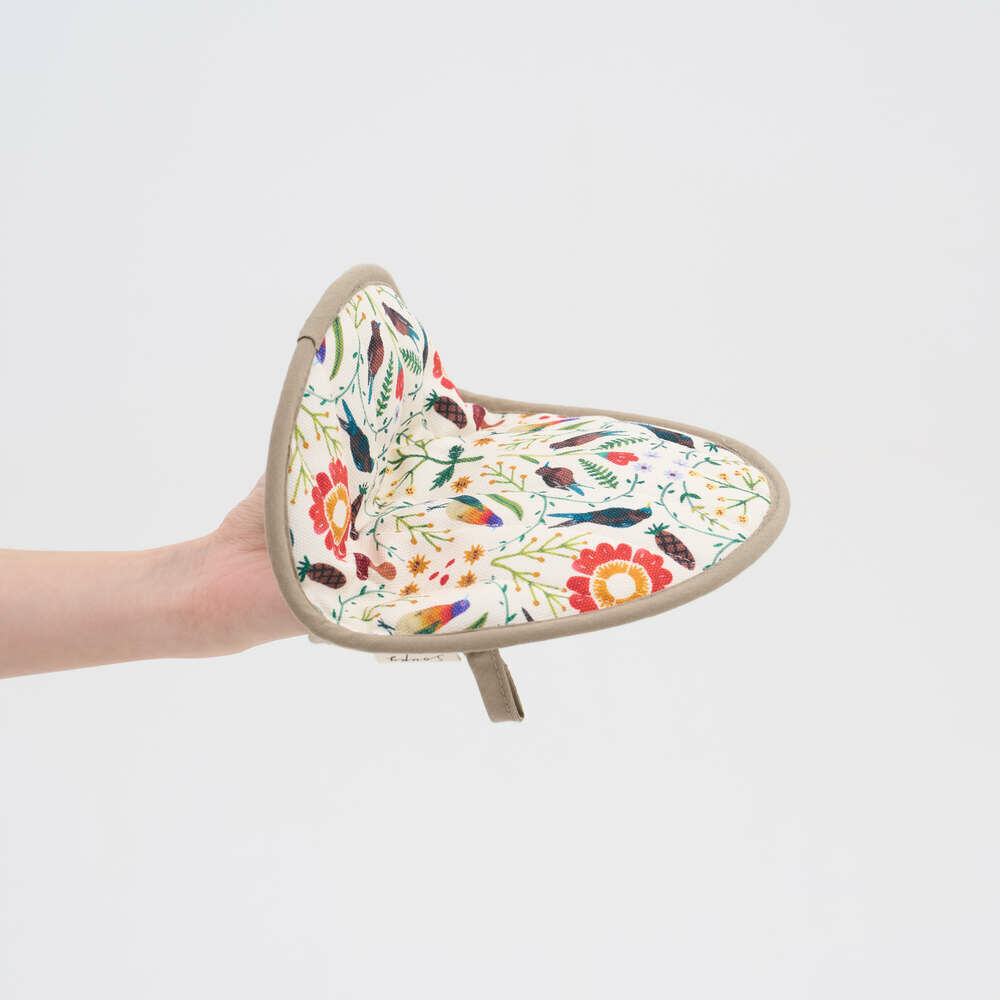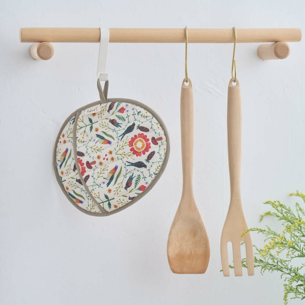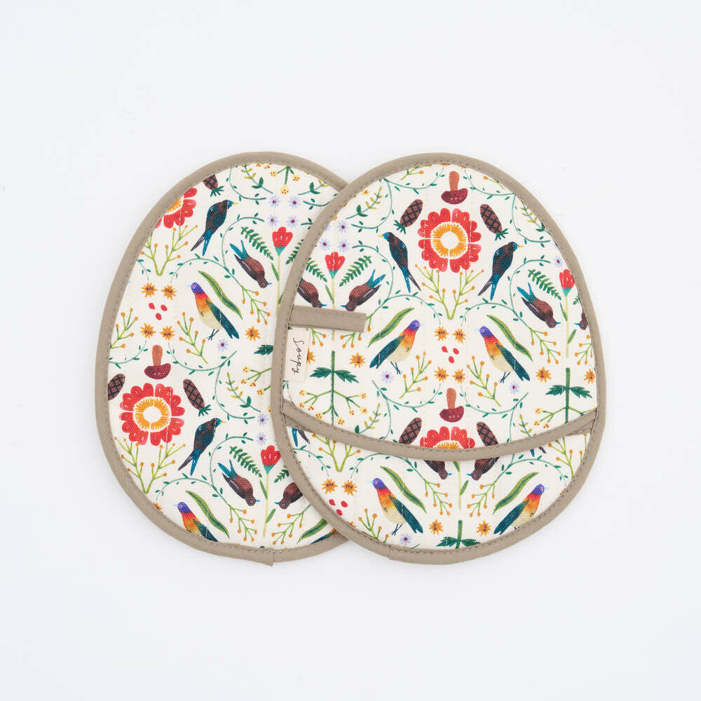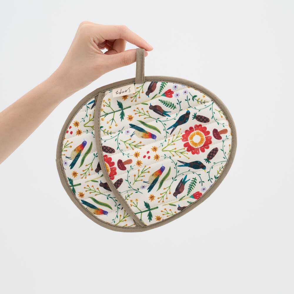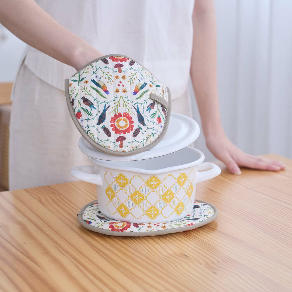 獨特的蛋形鋪棉手套鍋墊,不僅造型可愛實用性高,可以當隔熱手套取出燙手料理,也可放在桌面作為隔熱墊的聰明兩用設計。