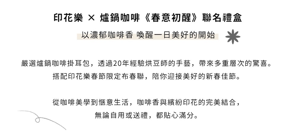 春節限定!印花樂職人手工絹印的布春聯,搭配「爐鍋咖啡」自家烘焙的單品精選咖啡,陪你迎接充滿香氣與喜氣的春節時刻。