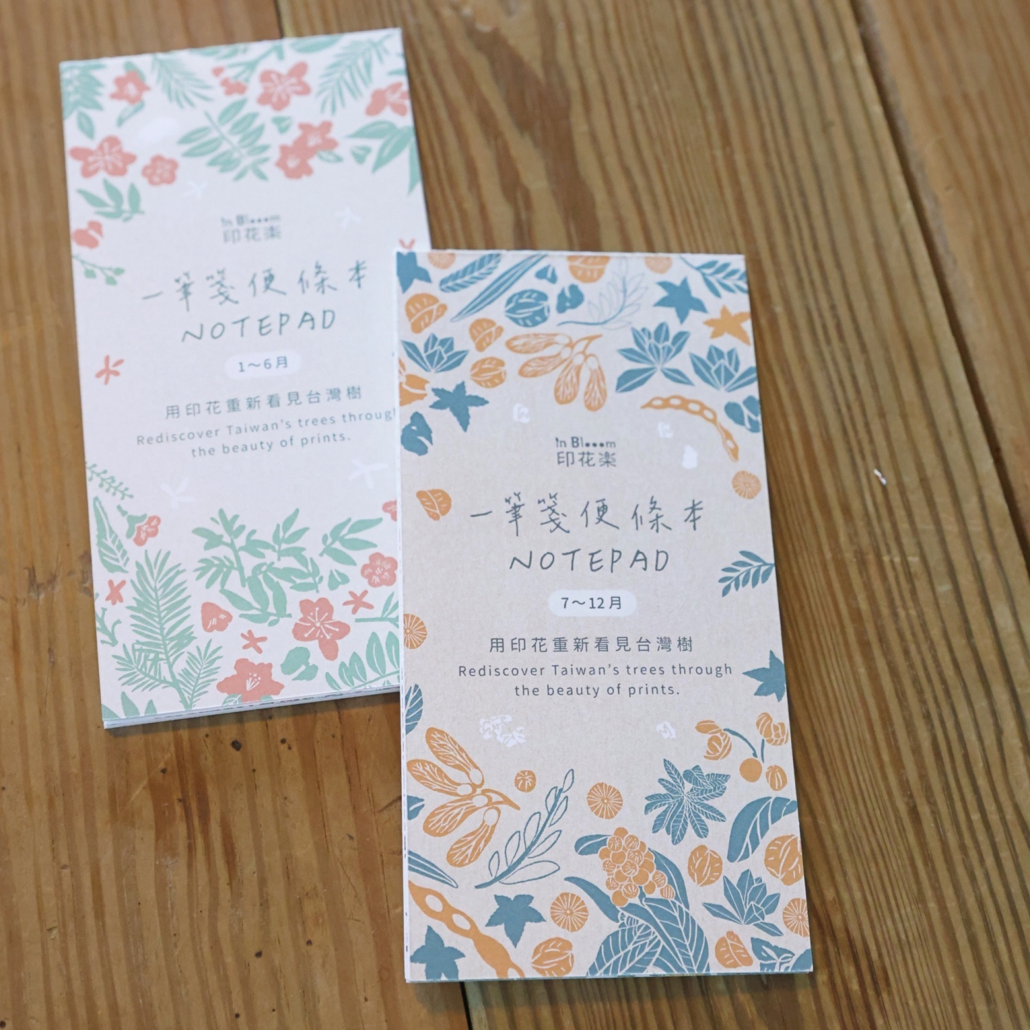 以12幅台灣原生樹印花設計為靈感,分為 1-6月、7-12月兩本,承載一年四季的自然變化,一本共25張。