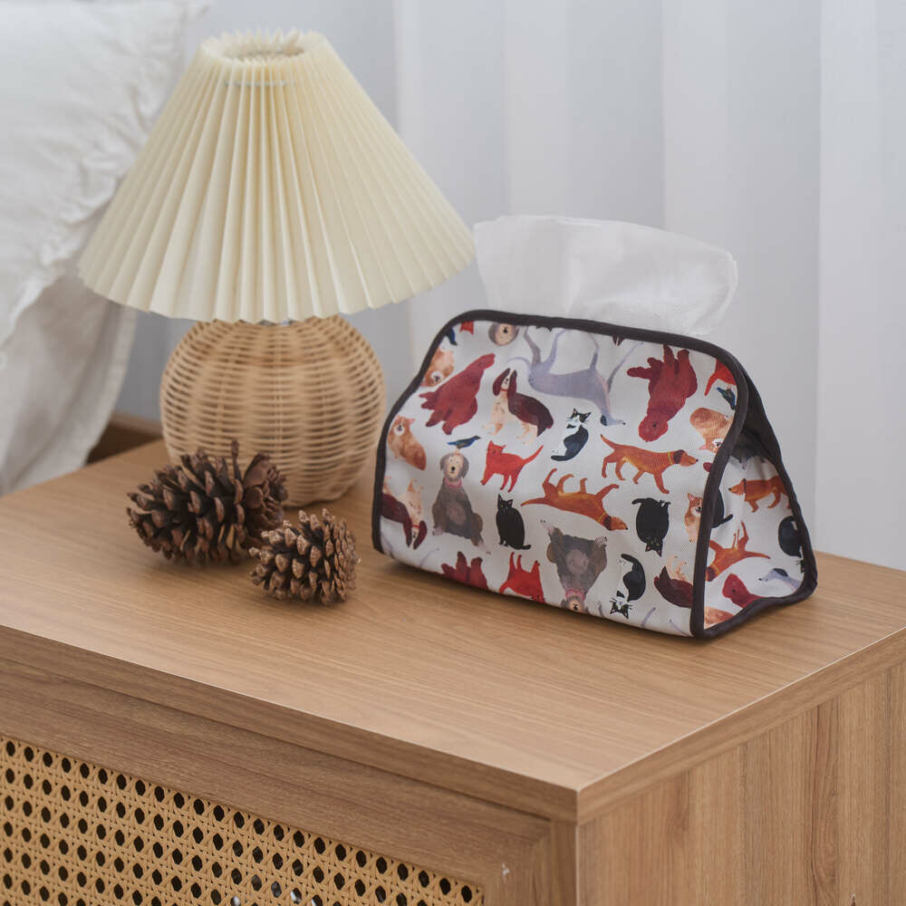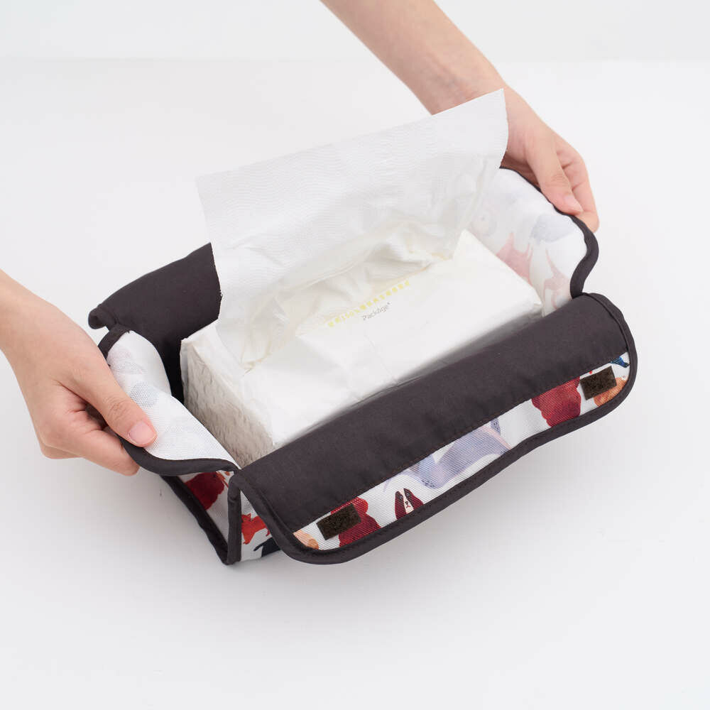 面紙套周邊以車縫加強,讓造型多了顏色搭配變化,也讓整體版型更硬挺,垂直懸掛不變形,即使面紙抽到最後一張也不會因內容物減少而扁塌。