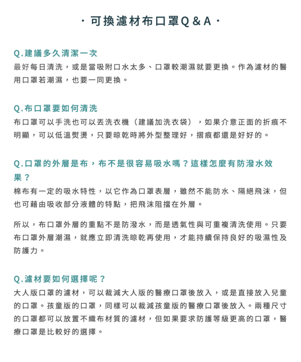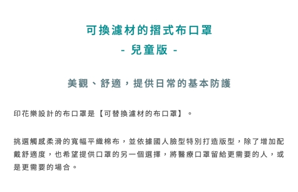 防疫新選擇!可替換濾材的布口罩,使用寬幅平織棉布,材質舒適透氣,耳朵鬆緊帶可自行調整長度,並為台灣人特別打造的版型設計,舒適服貼臉部,抵擋灰塵!