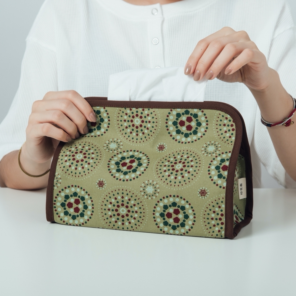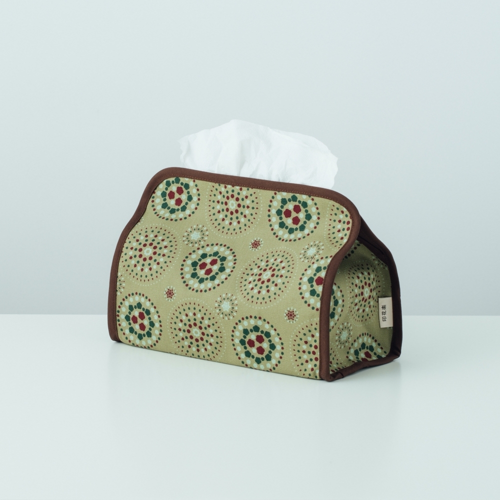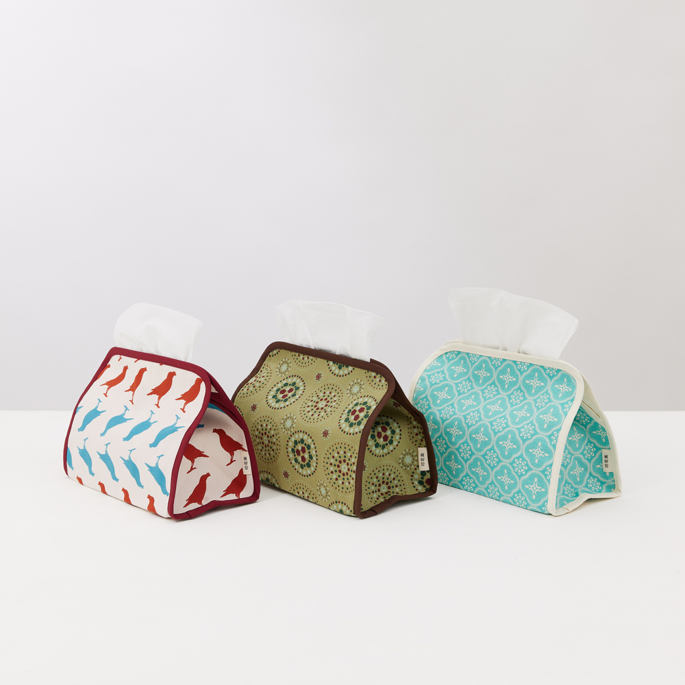 印花樂小屋面紙套,簡單俐落的外型,搭配印花圖案設計,能融入居家環境,成為點綴氣氛的別緻裝飾。兩端有吊掛用的耳朵,方便掛在家中、車上任何有吊鉤的位置,版型硬挺,抽到最後一張也不會因內容物減少而扁塌。
