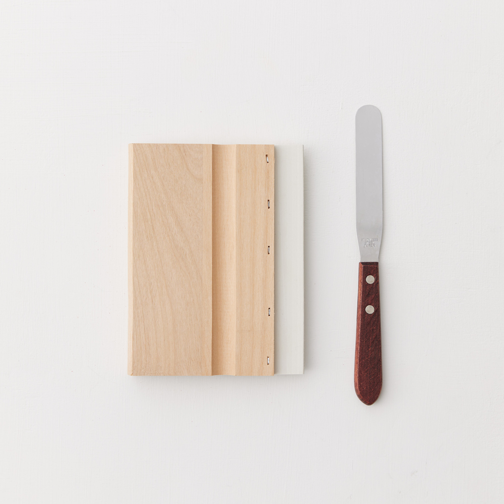 絹印中印製顏料所需的工具組合。調刀為挖取顏料使用的工具,扁刀型不鏽鋼設計,取用或回收都好使用。刮刀為刮印時使用的工具,以橡膠版搭配木製握柄,好握好使力,也易於清洗。