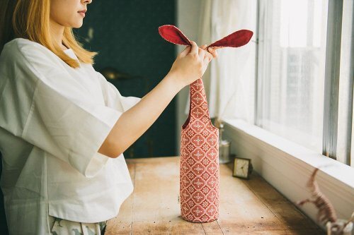 水瓶提袋的兩條帶子造型看起來像兔子耳朵。大尺寸的兔耳袋,適合攜帶冬季的保溫瓶,甚至是作為酒類餽贈的外袋,造型別緻獨特,功能實用